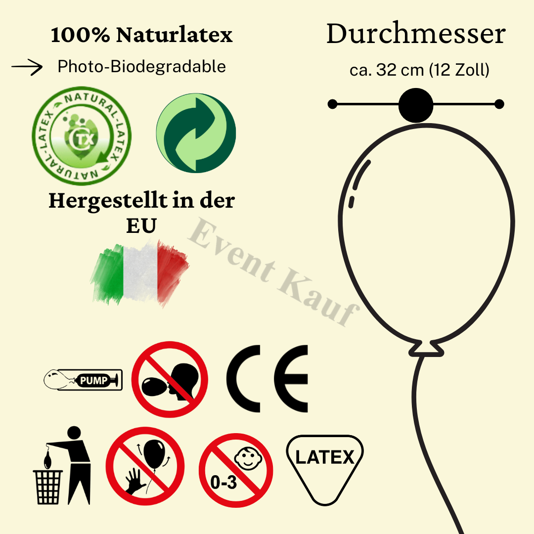 Unsere Natur-Latex Ballons sind biologisch abbaubar und werden besonders gut durch UV-Licht zersetzt. Das heißt jedoch auch dass die Ballons vor direkter Sonneneinstrahlung und Hitze zu schützen sind, da diese zum Platzen oder Verblassen der Ballons führen kann. Nicht für den Gebrauch im Außenbereich geeignet. - zur Heliumbefüllung geeignet - Flugzeit in geschlossenen Räumen ca. 18 Stunden