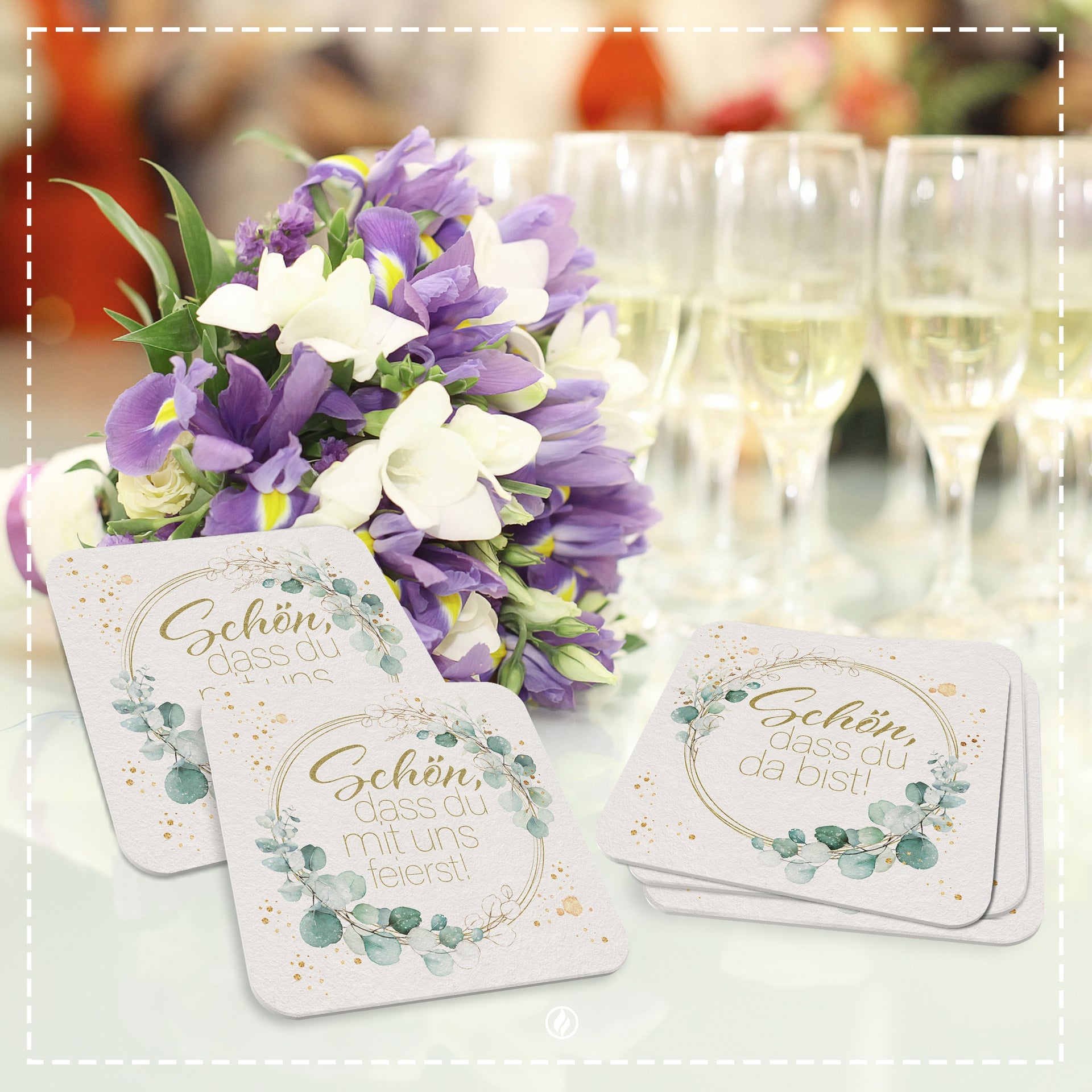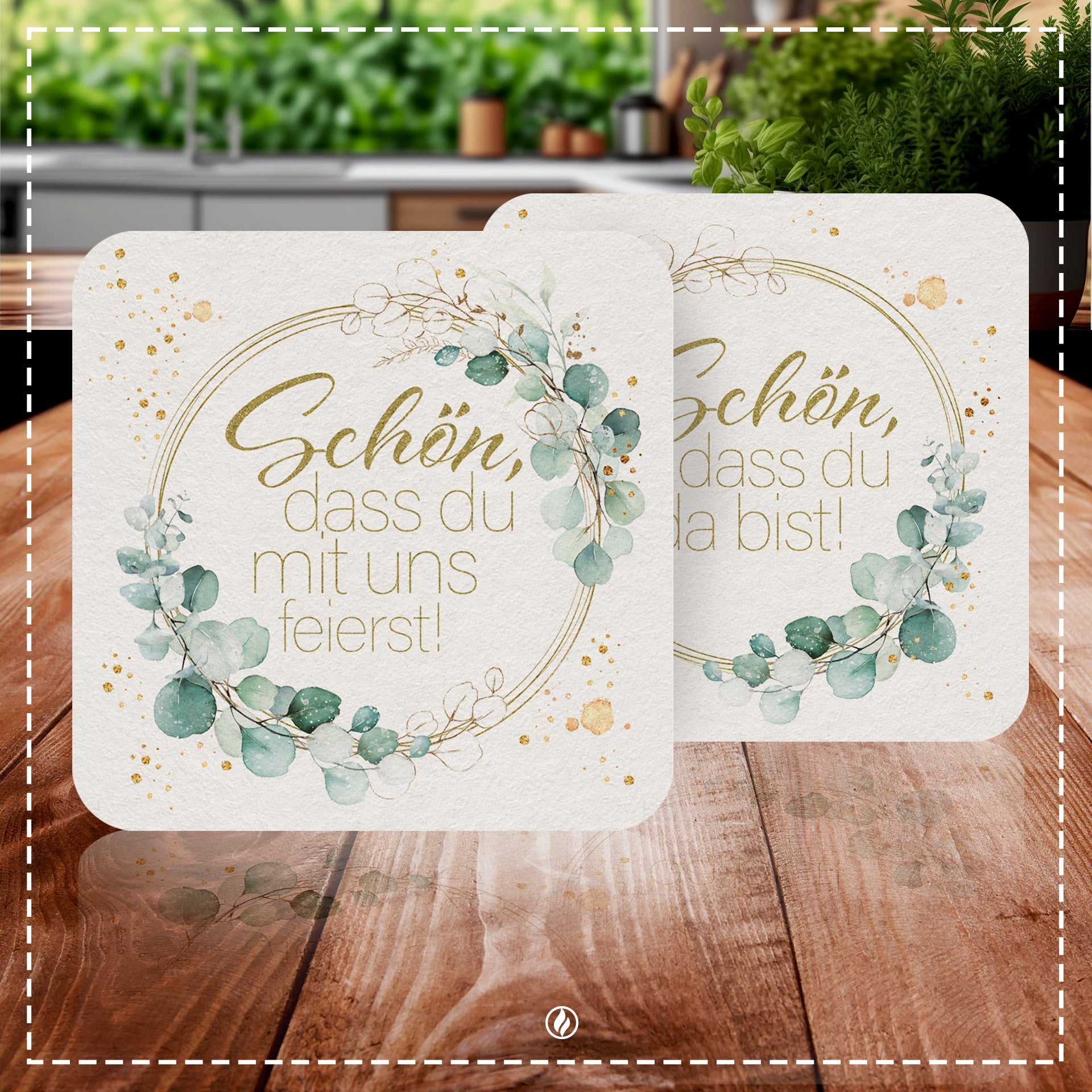 50x Bierdeckel 'Schön, dass du da bist' in Grün Floral mit Efeu