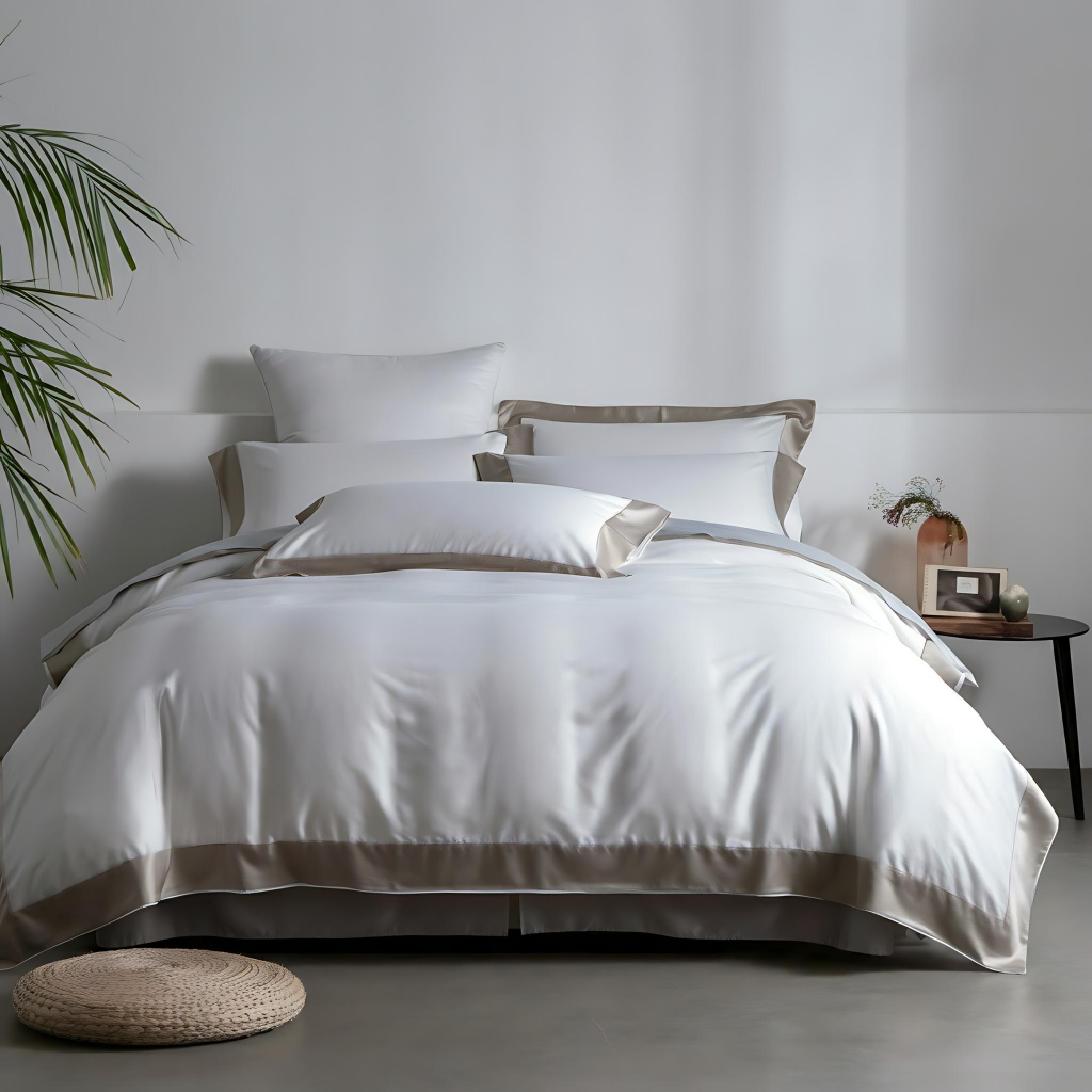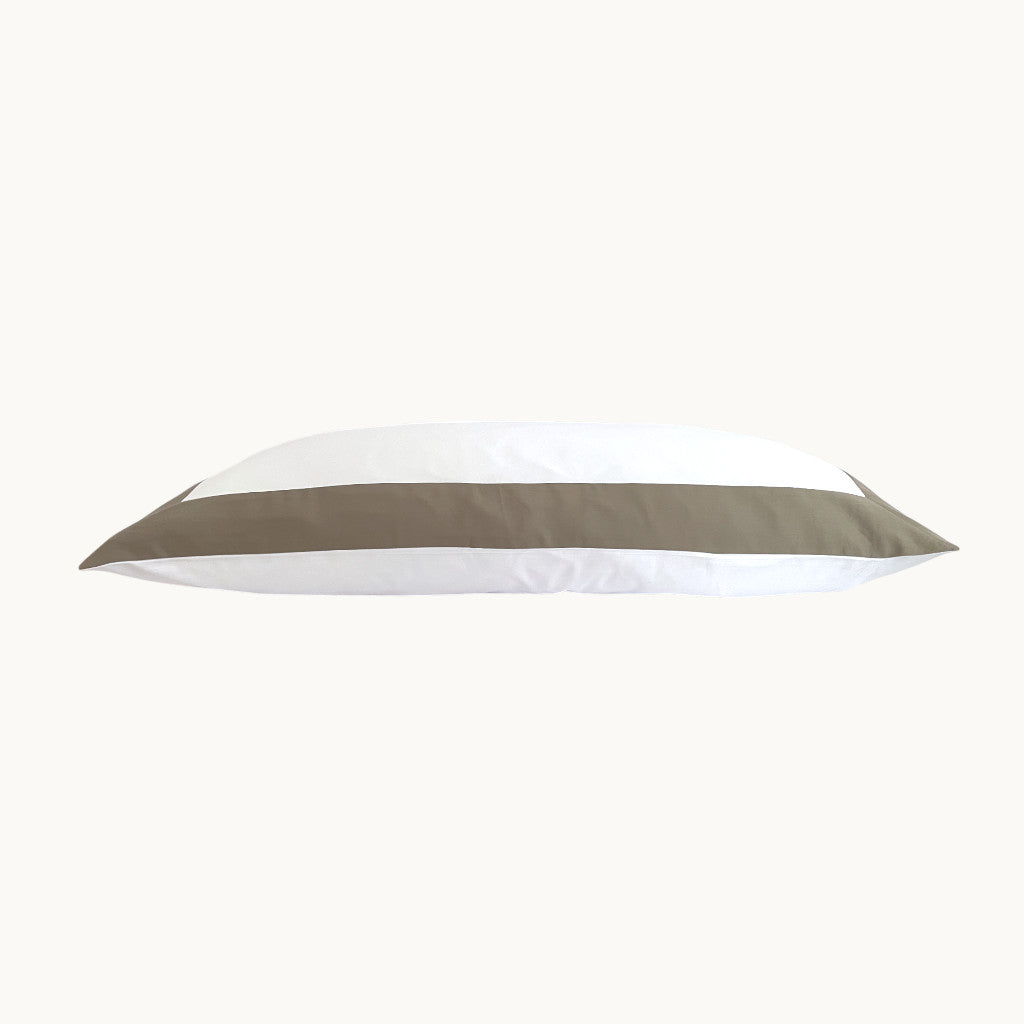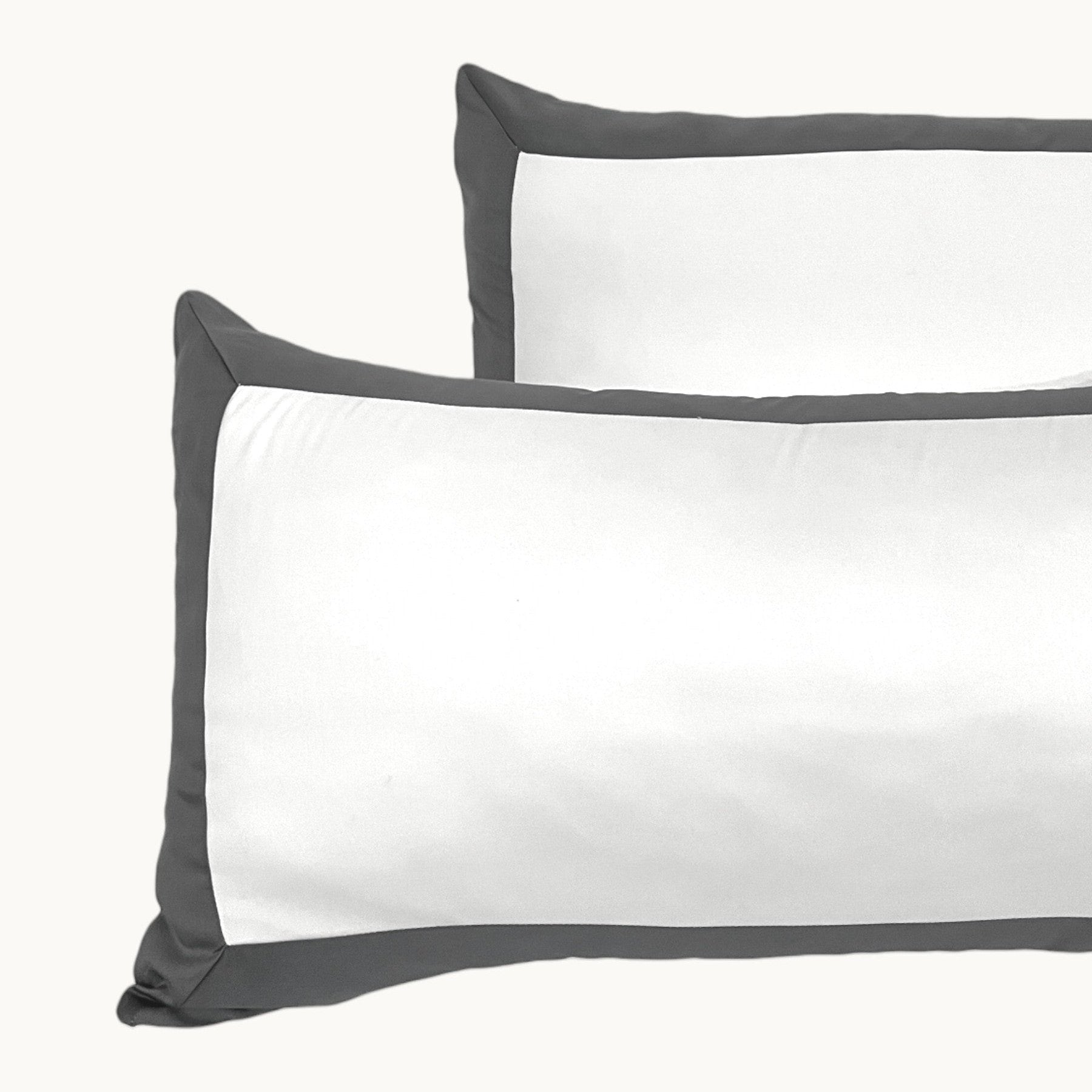 Die Kissenbezüge der Eklipse Kollektion fallen durch ihr modernes Design auf, das durch eine auffällige weiße Basis und breite farbige Ränder gekennzeichnet ist. Hergestellt aus 100% ägyptischer Baumwolle mit extra langen Stapelfasern in einem feinen 600-Fadendichte Satinwebstoff, bieten diese Kissenbezüge sowohl Luxus als auch Langlebigkeit, abgerundet durch Couture-Details wie Gehrungsecken für ein poliertes Aussehen.