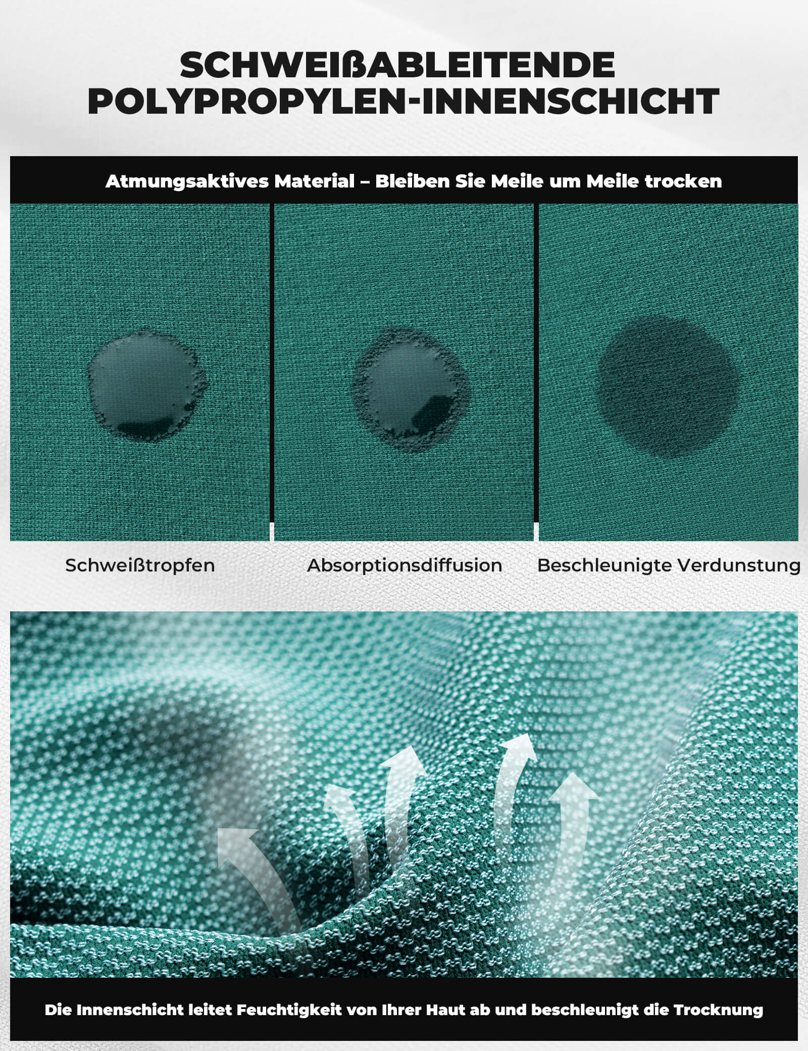 Gefertigt aus Polypropylen für außergewöhnliche Elastizität, Abriebfestigkeit und Formbeständigkeit. Bietet hervorragende Feuchtigkeitsableitung und schnelltrocknende Eigenschaften, während die Polyester Außenschicht mit Baumwollgefühl die Verdunstung unterstützt