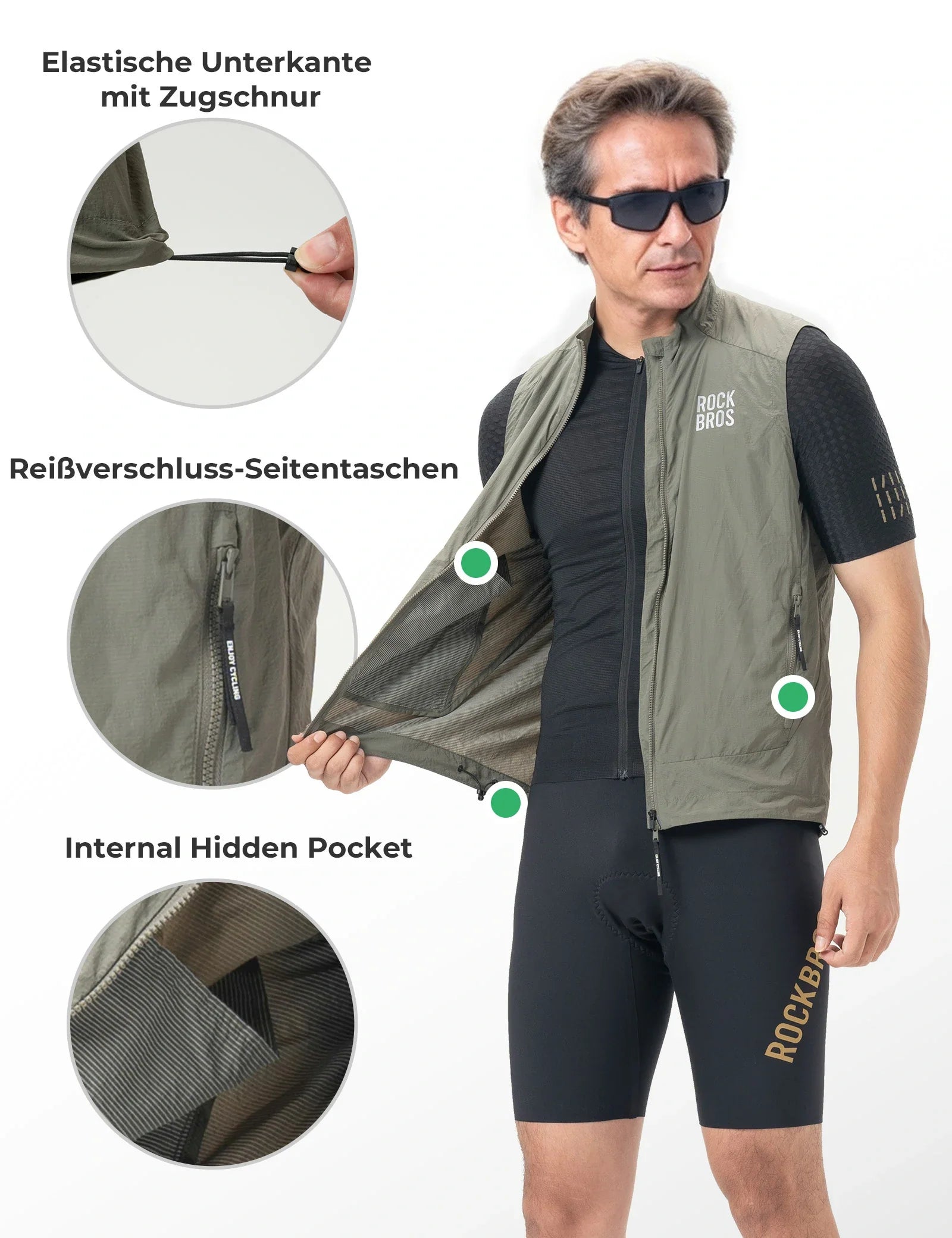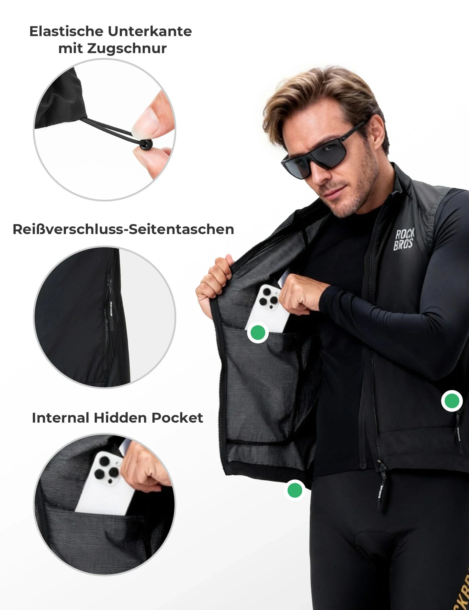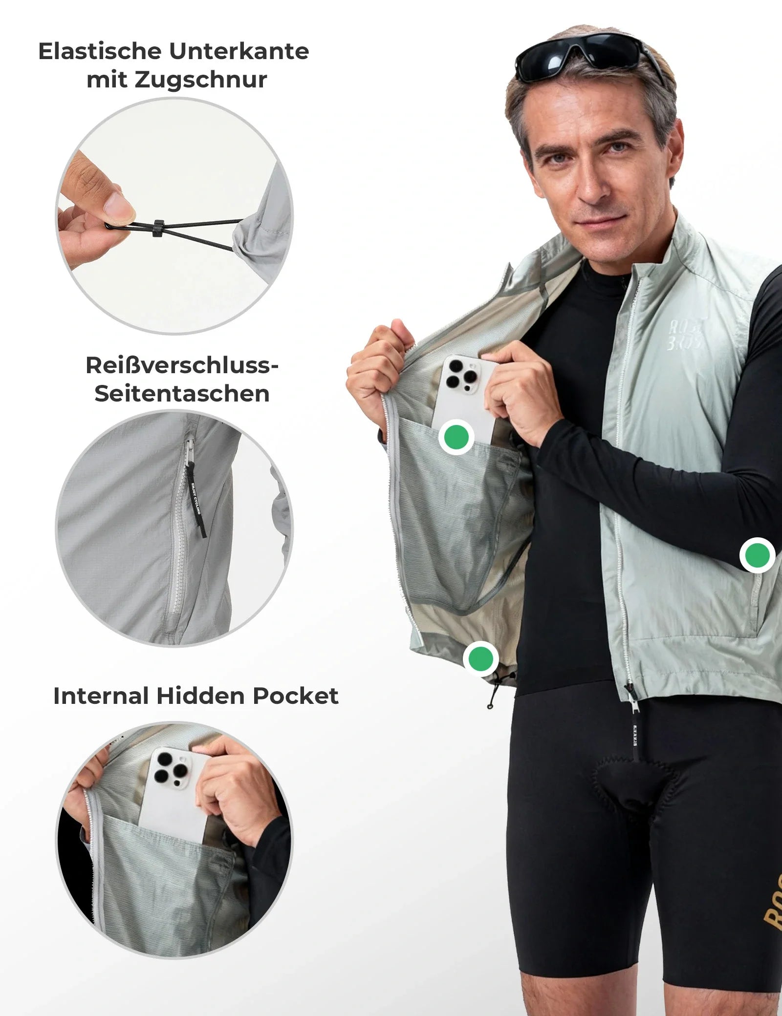 Mit zwei seitlichen Reißverschlusstaschen und versteckten Innentasche bietet die Weste sicheren Stauraum für Handy, Schlüssel oder Karten, stets griffbereit und gut geschützt