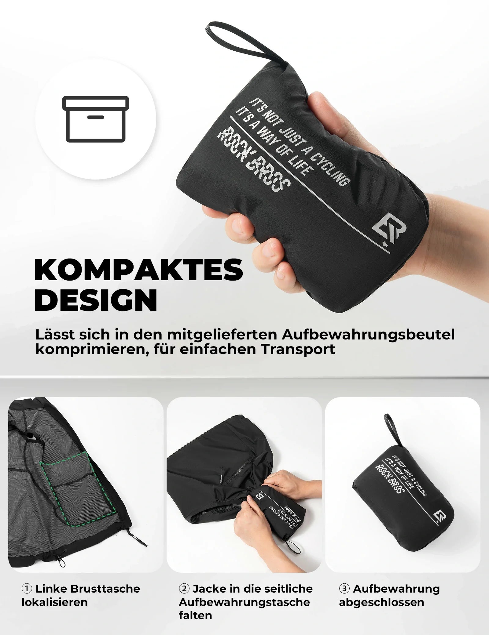 Die integrierte Stautasche ermöglicht es, die Weste kompakt in sich selbst zu verstauen. Ideal für Radtouren, Pendeln oder als schnelle Zusatzschicht für unterwegs