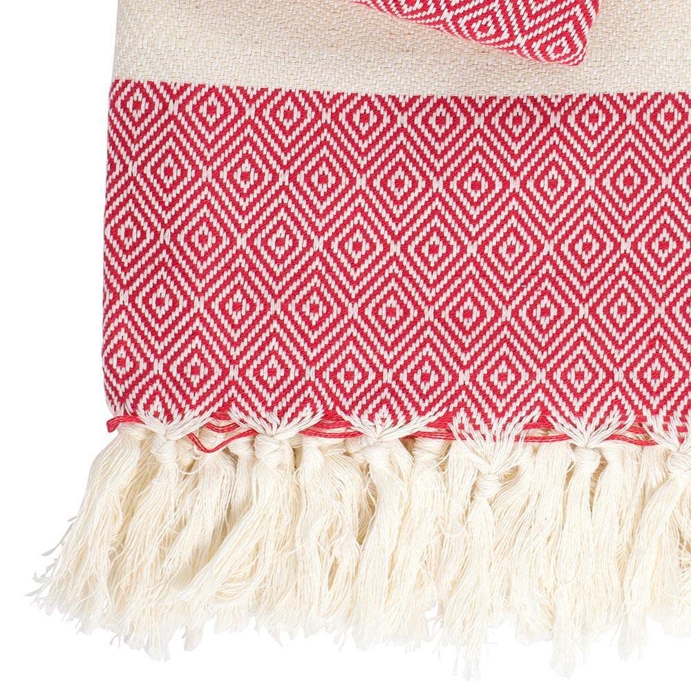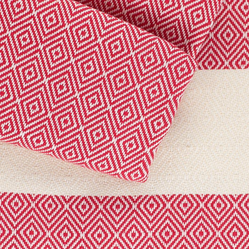 ca. 100 x 170 cm, 100% Baumwolle, naturweiß/rot, ca. 400 Gramm, Flächengewicht 220 g/m². Waschen bis 40 Grad, Wäschetrockner möglich (Waschanleitung Hamamtuch).