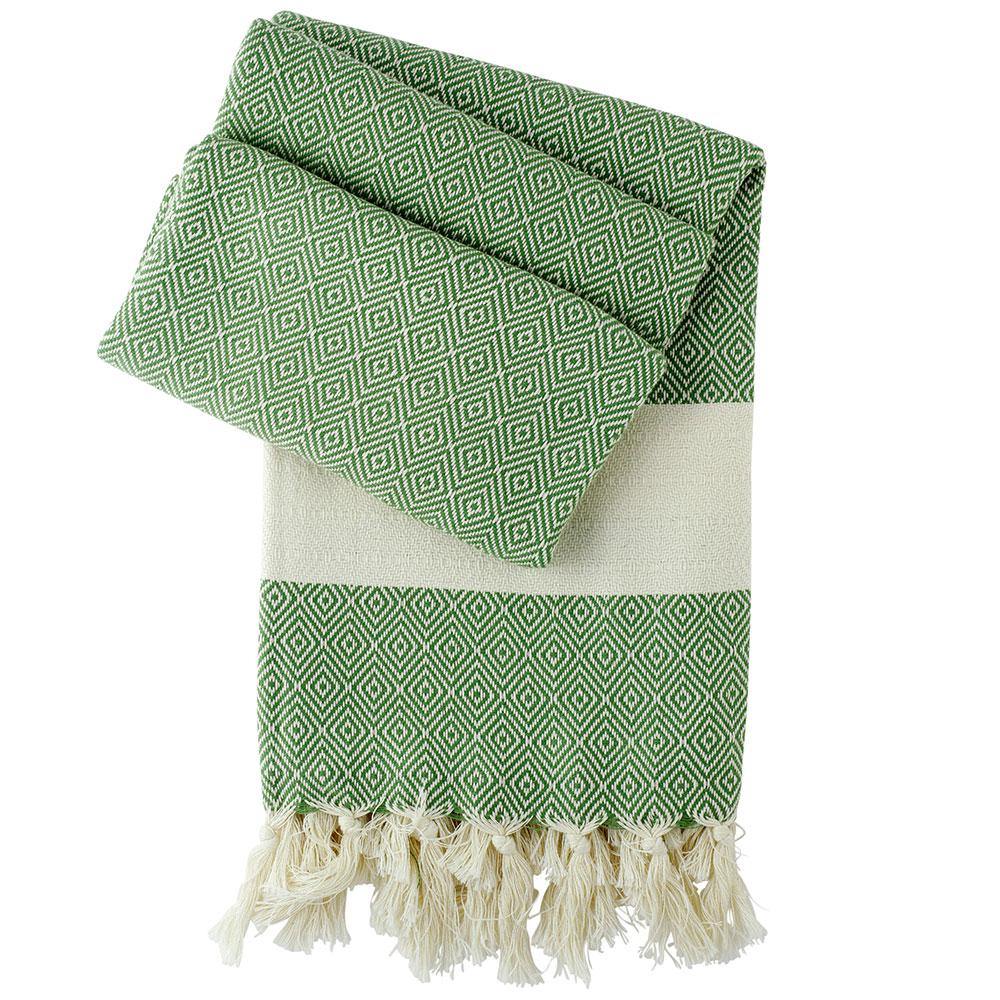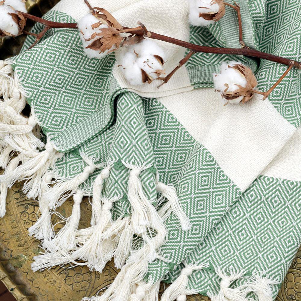 ca. 100 x 170 cm, 100% Baumwolle, naturweiß/tannengrün, ca. 400 Gramm, Flächengewicht 220 g/m². Waschen bis 40 Grad, Wäschetrockner möglich (Waschanleitung Hamamtuch).