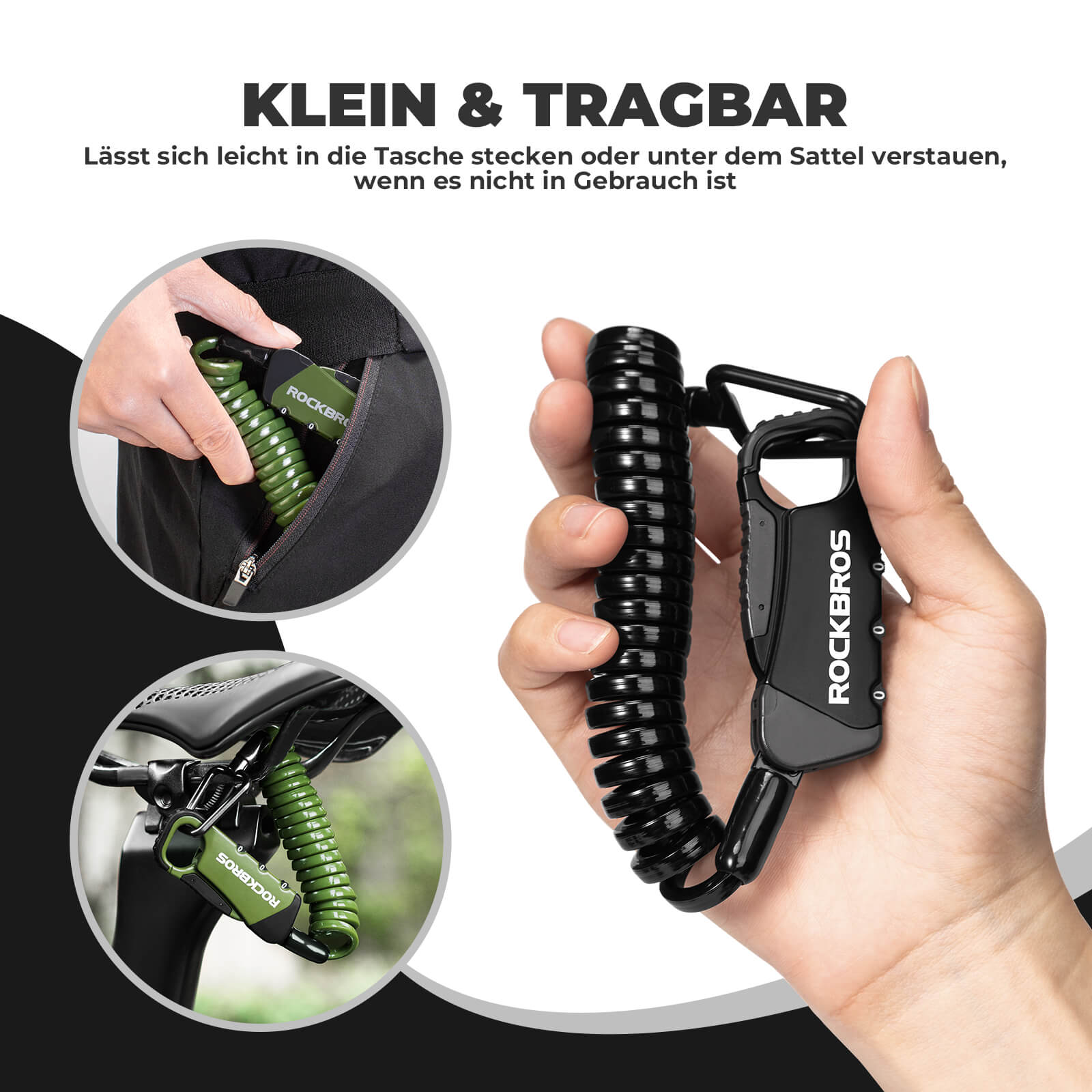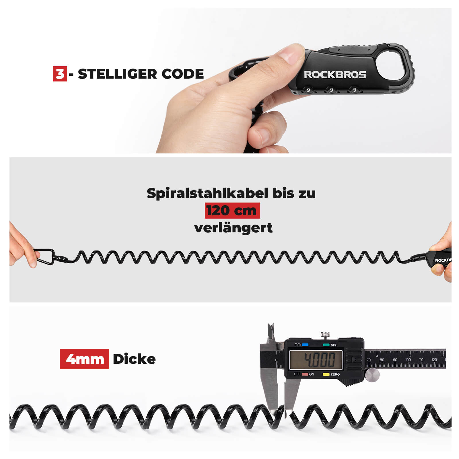 ROCKBROS Robustes Zahlenschloss aus Zinklegierung mit 120 cm spiralförmigem Stahlkabel. 3-stelliger Kombinationsmechanismus für sicheren Schutz ohne Schlüsselverlust. Wasserdicht, kratzfest und ideal für Helme, Motorräder, E-Bikes, Scooter Kinderwagenund und mehr.