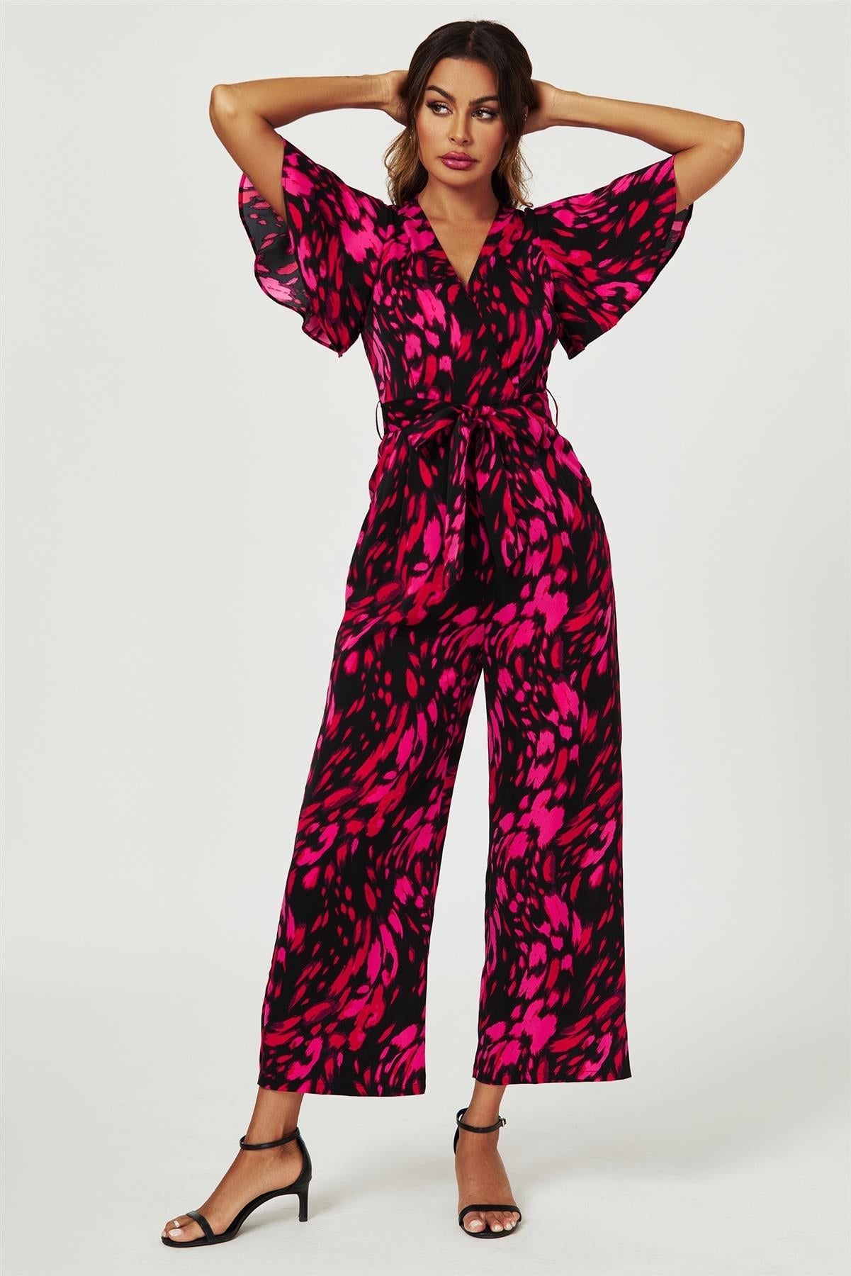 Elevate your wardrobe with our Pink Abstract Print Wrap Top Jumpsuit in Black. This chic jumpsuit combines modern elegance with artistic flair, featuring a striking pink abstract print against a sleek black backdrop. The wrap top design accentuates your waist, creating a flattering silhouette, while the comfortable fabric ensures ease of movement. Perfect for both casual outings and special occasions, this jumpsuit offers a versatile and stylish option that will make a bold statement wherever you go.