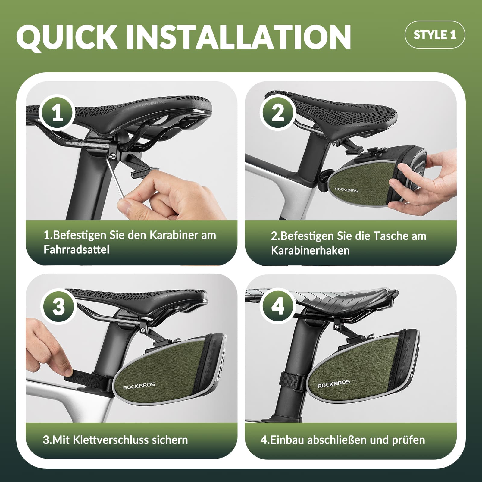Es gibt zwei Modelle zur Auswahl. Sie können je nach Bedarf zwischen Klettverschlüsse und ABS-Schnallen wählen. Die Fahrradtasche lässt sich einfach unter dem Sattel installieren und sicher am Sattel und an der Sattelstütze befestigen, ohne zu wackeln und Ihr Fahrerlebnis zu beeinträchtigen.