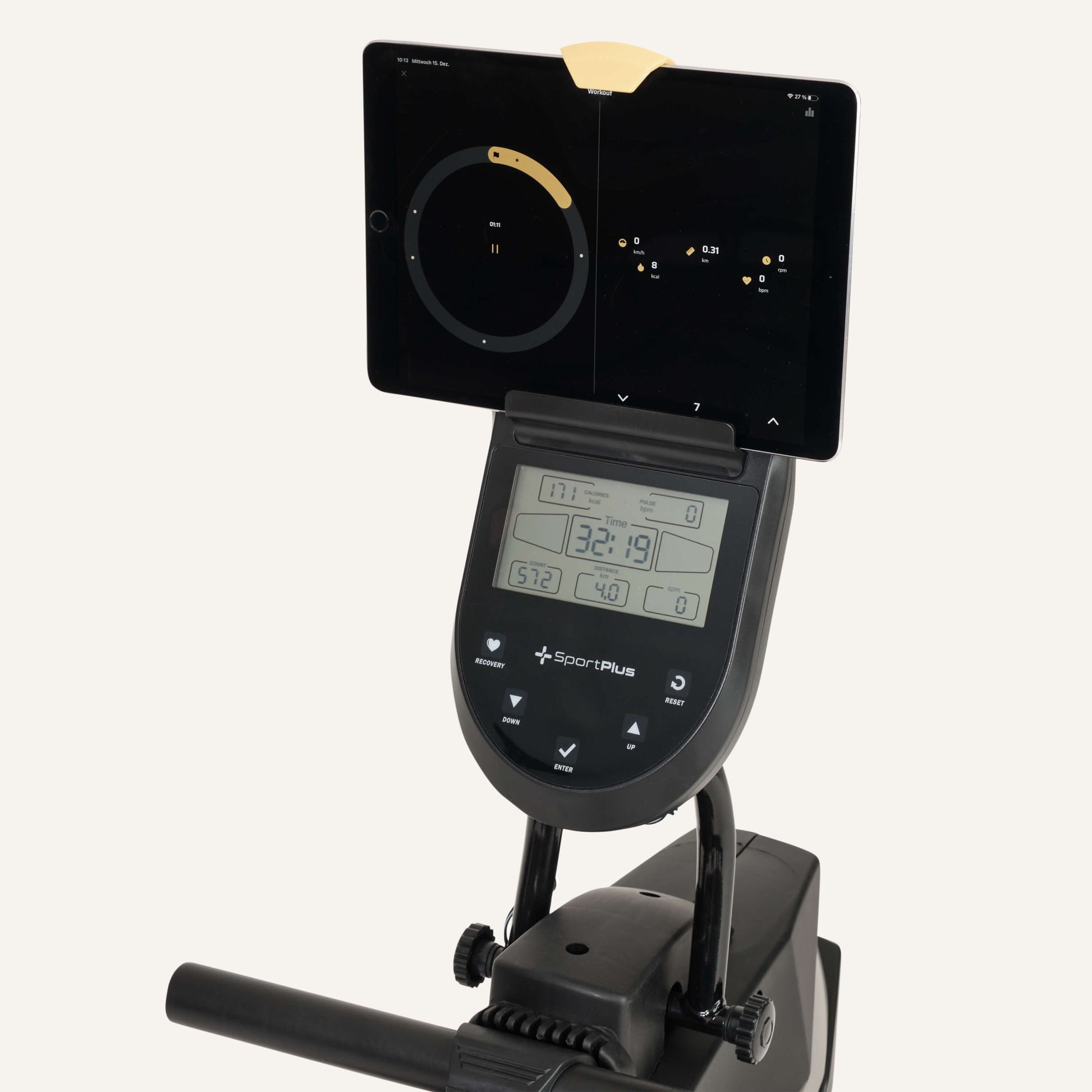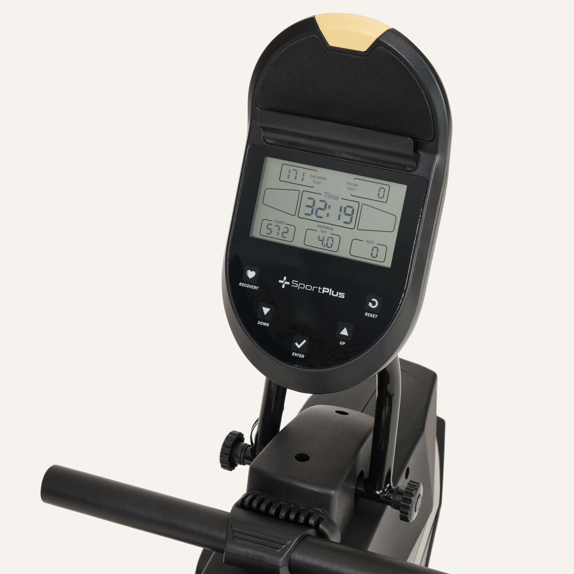 - Trainingscomputer liefert Angaben zur Anzahl der gesamten Ruderzüge, Trainingszeit, Distanz, Ruderzüge pro Minute, ca. Kalorienverbrauch und Puls
