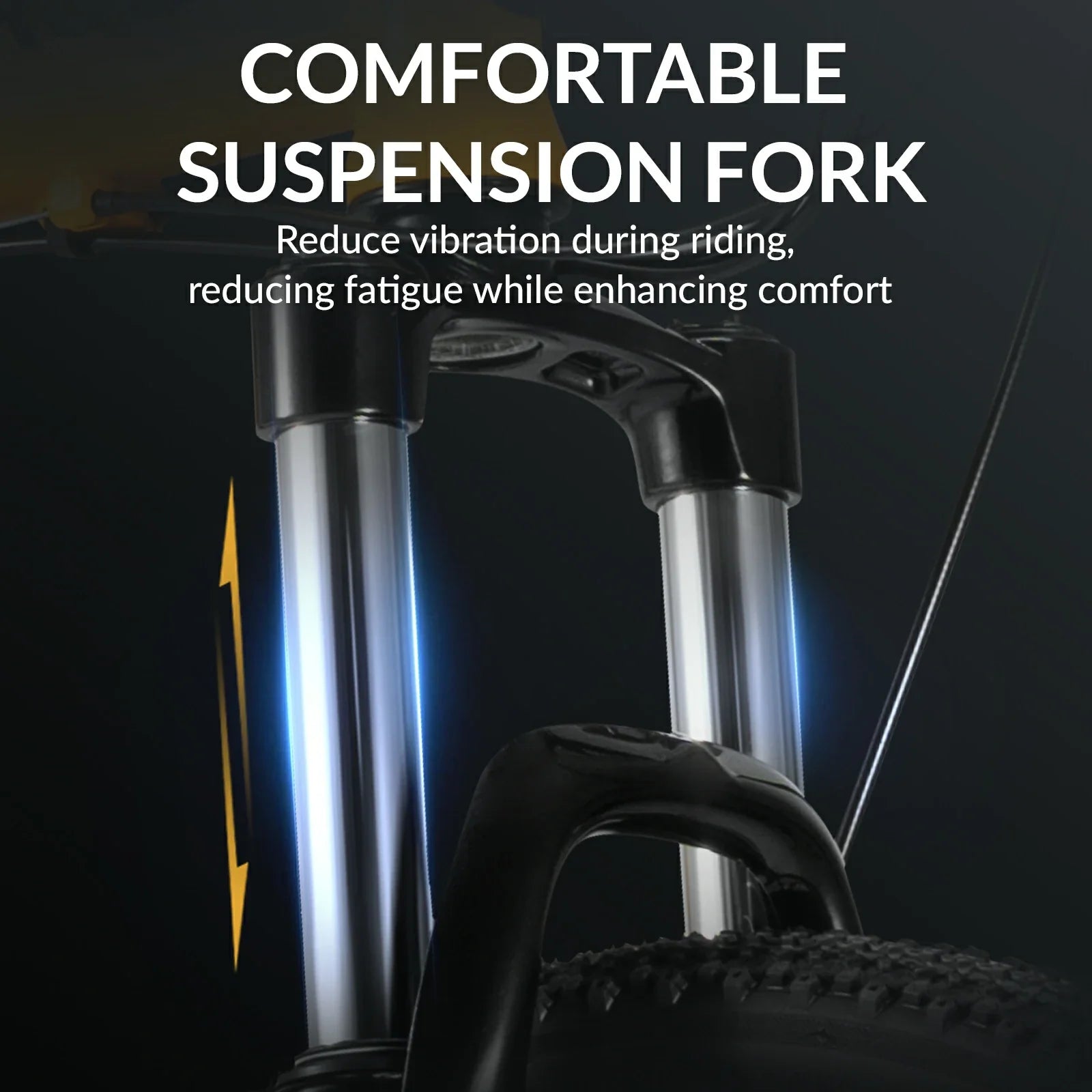 Die robuste Aluminium-Federgabel absorbiert Risse im Gehweg und Straßenschäden, sorgt für effizientes Treten und reduziert Ermüdung bei langen Fahrten – für spürbar mehr Komfort