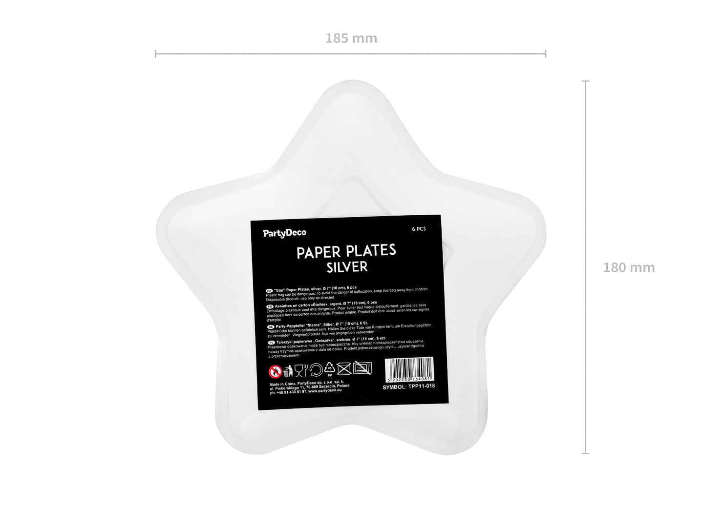 Teller Stern aus silberfarbenem, metallisiertem Papier, Durchmesser ca. 18 Zentimeter. (1 VPE / 6 Stk.)