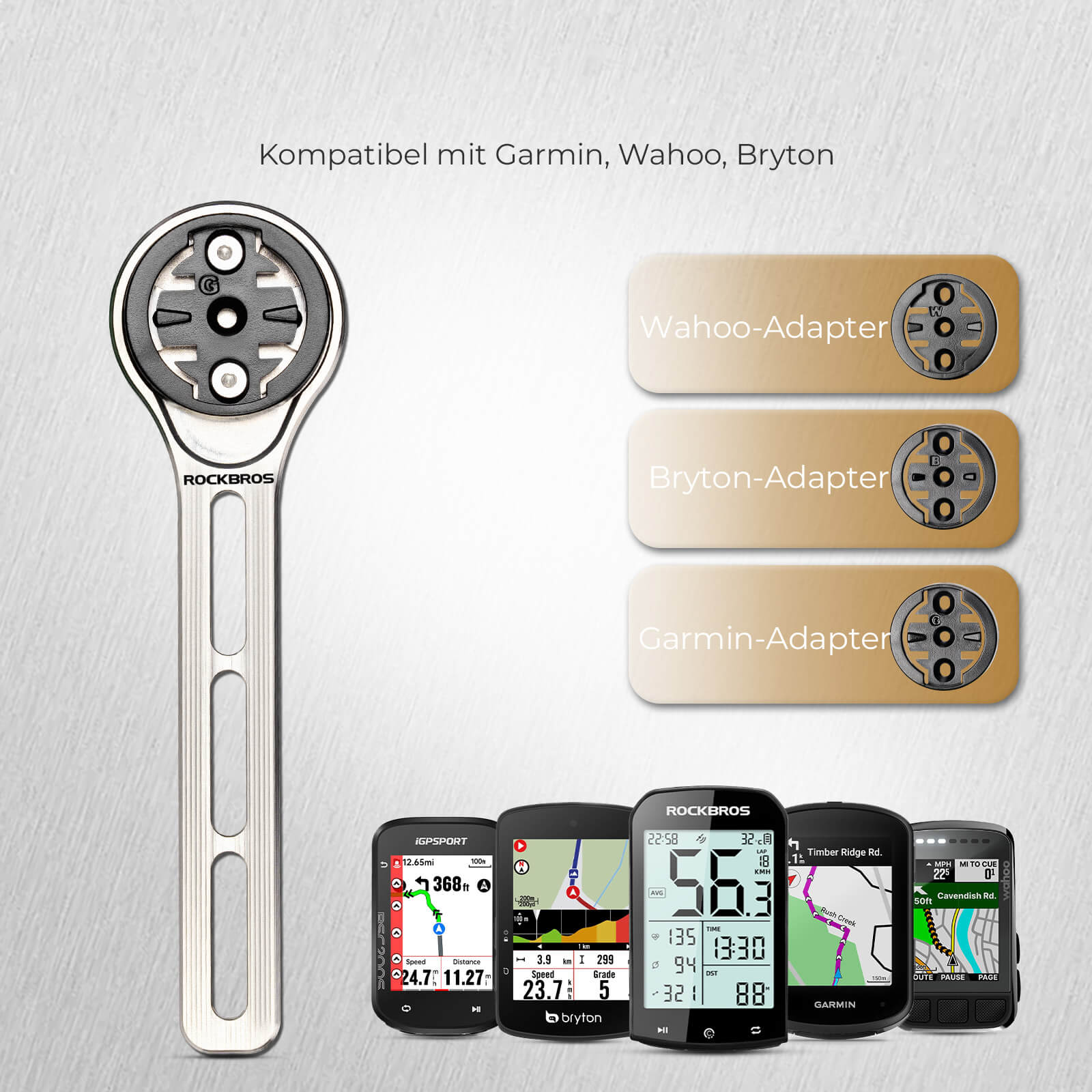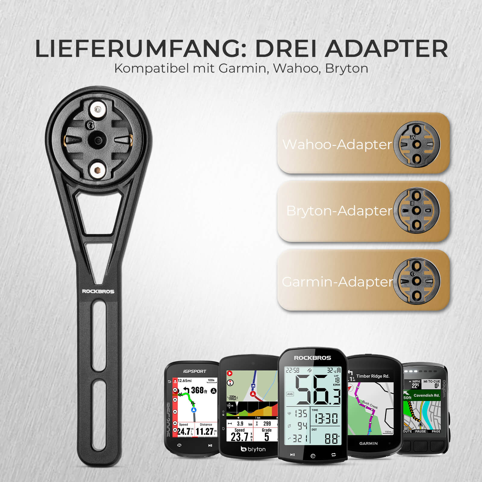 Drei Adapter inklusive für nahtlose Passform mit Garmin, Wahoo und Bryton. Ideal für Wechsel zwischen verschiedenen Fahrradcomputern ohne zusätzliche Anschaffungen.